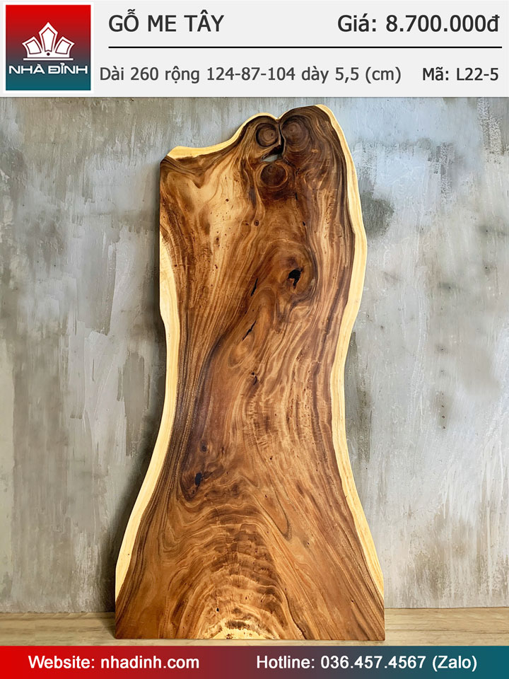 Mặt Bàn Ăn Gỗ Me Tây Nguyên Khối Dài 260 Rộng 124-87-104 Dày 5,5 (cm)