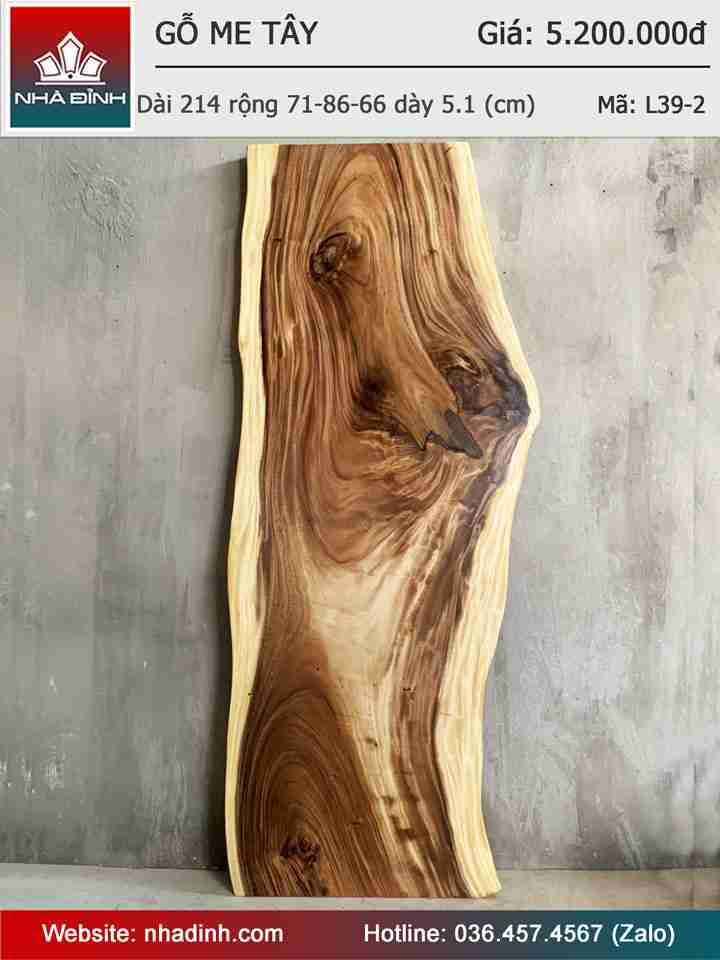 Mặt Bàn Gỗ Me Tây Nguyên Khối Dài 214 Rộng 71-86-66 Dày 5.1 (cm)