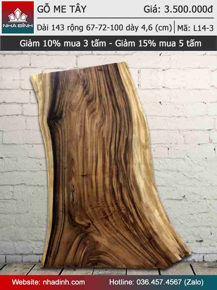 Mặt bàn gỗ Me Tây nguyên khối dài 1430 rộng 670-720-1000 dày 46 (mm)