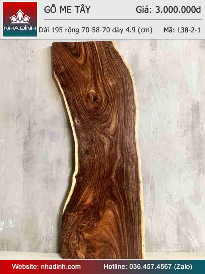 Mặt Bàn Gỗ Me Tây Nguyên Khối Dài 195 Rộng 70-58-70 Dày 4,9 (cm)