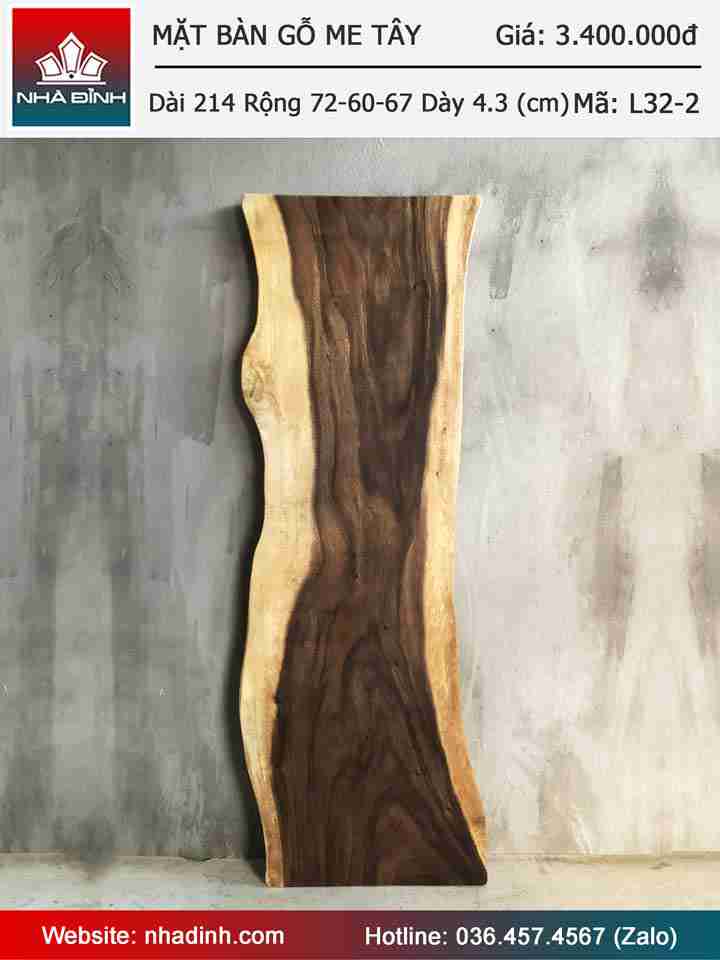 Mặt Bàn Gỗ Me Tây Nguyên Khối Dài 214 Rộng 72-60-67 Dày 4,3 (cm)