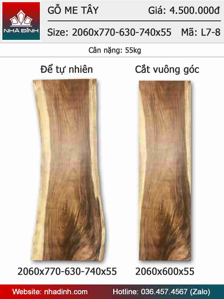 Mặt bàn gỗ Me Tây nguyên khối dài 2m06 rộng 77-63-74 dày 5,5 (cm)