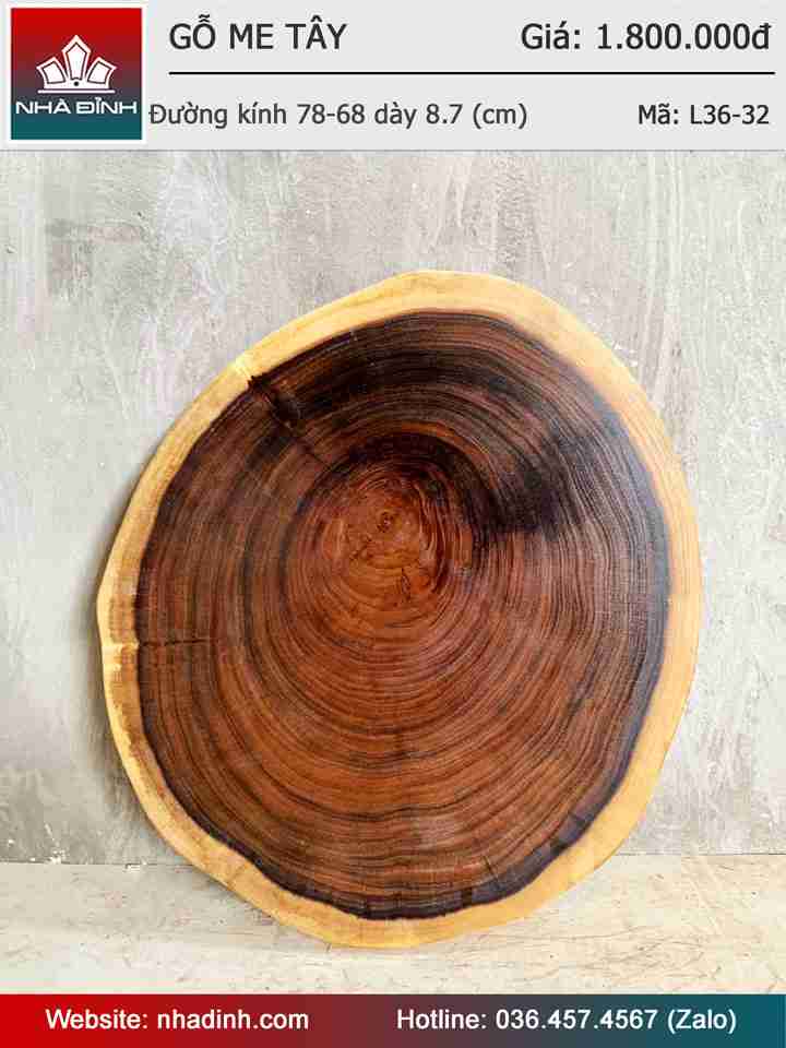 Mặt Bàn Gỗ Me Tây Nguyên Khối Đường Kính 78-68 Dày 8.7 (cm)
